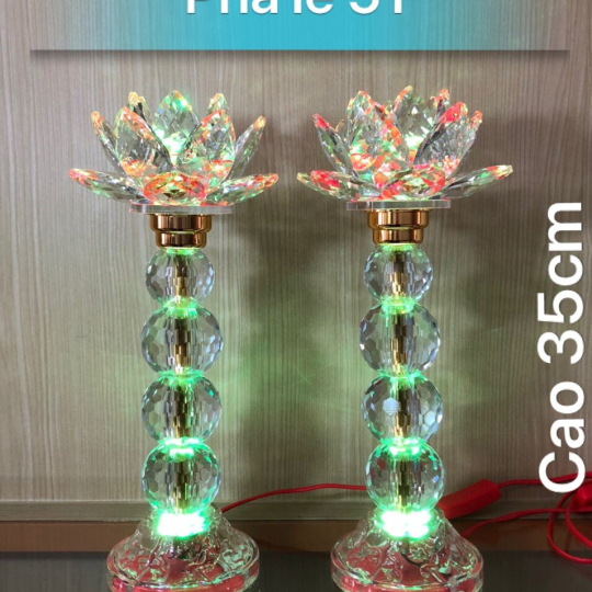 - Đặc điểm: Thiết kế thân và đế hình trụ được vẽ hoa sen trên đầu gắn bông hoa sen bằng pha lê khi thắp đèn led bên trong lên tỏa ra ánh sáng đẹp lung linh huyền ảo.
